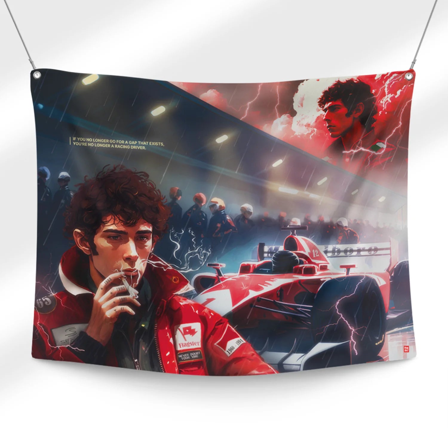 The Rainmaster Flag isn’t just art — it’s a tribute. A storm-chasing, throttle-pushing, legacy-packed shoutout to Ayrton Senna, the icon who turned rainy circuits into his playground. 🌧️🔥